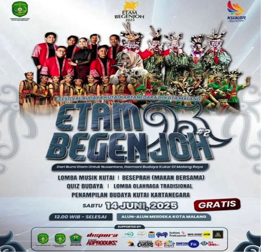 Mediasiutama, MALANG – Gelaran budaya tahunan Etam Begenjoh kembali hadir meriahkan Kota Malang dan akan berlangsung di Alun-alun Merdeka pada Sabtu (14/6/2025), menampilkan kekayaan budaya asli Kutai Kartanegara.