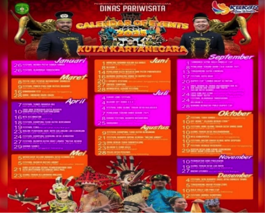 Mediasiutama, Kukar – Kutai Kartanegara resmi merilis Calendar of Event (COE) 2025 sebagai acuan resmi dalam penyelenggaraan berbagai kegiatan pariwisata selama setahun penuh. Inisiatif ini mengusung kolaborasi antara masyarakat, pelaku usaha kecil menengah, dan pemerintah untuk memaksimalkan potensi ekonomi lokal melalui event yang terstruktur.