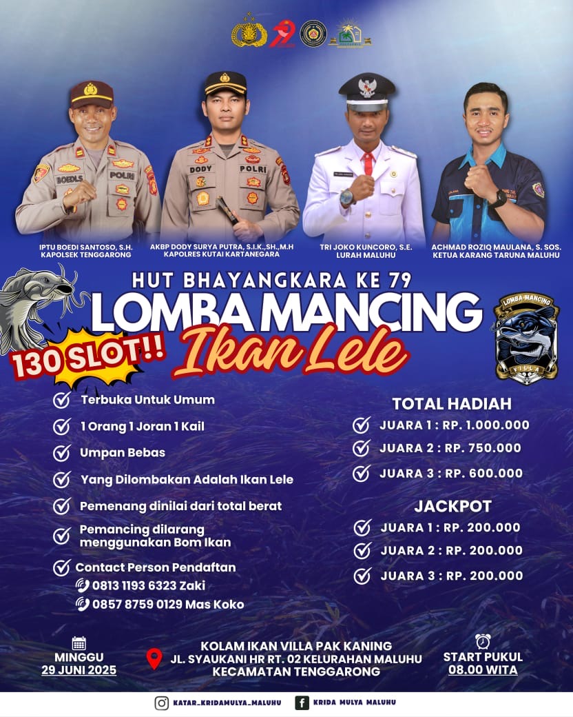Mediasiutama.com, Kukar – Pemerintah Kelurahan Maluhu, bekerja sama dengan Polsek Tenggarong, dan Polres Kutai Kartanegara, dan Karang Taruna Maluhu, dalam rangka memeriahkan HUT Bhayangkara Ke-79, akan melaksanakan Lomba Mancing pada hari Minggu (29/6/25), bertempat di Sasana Kaning Park, di Jalan Syaukani H.R, Kelurahan Maluhu, Tenggarong, Kalimantan Timur.